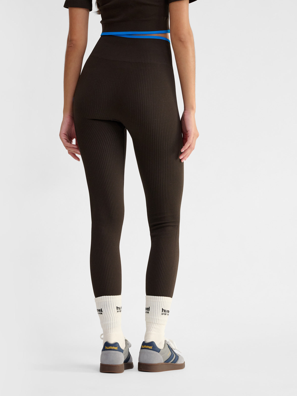 KNITTED women's leggings fit perfectly to the body, are seamless, therefore ensuring comfort without friction, there is a pocket on the thigh. Hummel logo and contrasting color details complete the look.