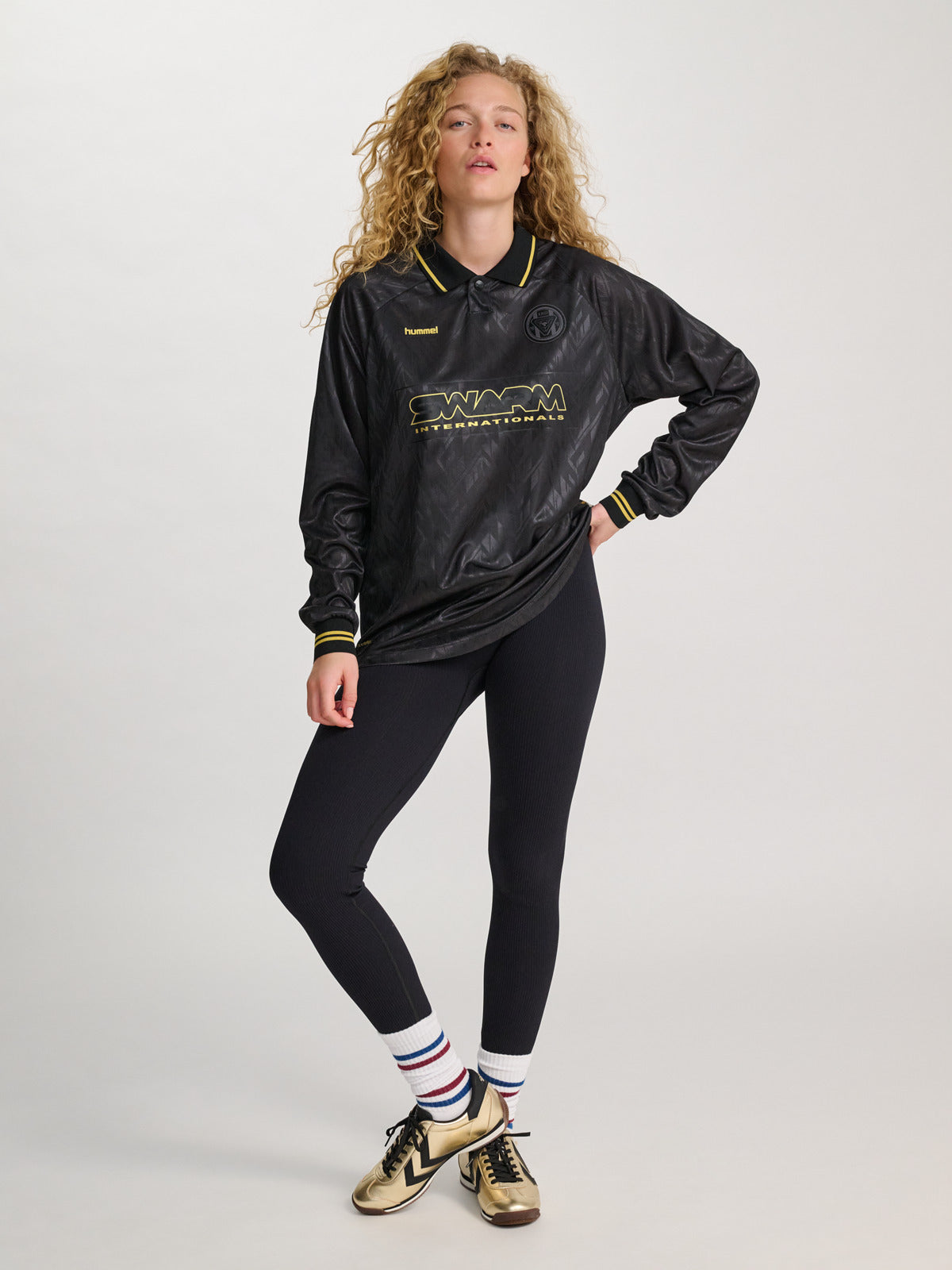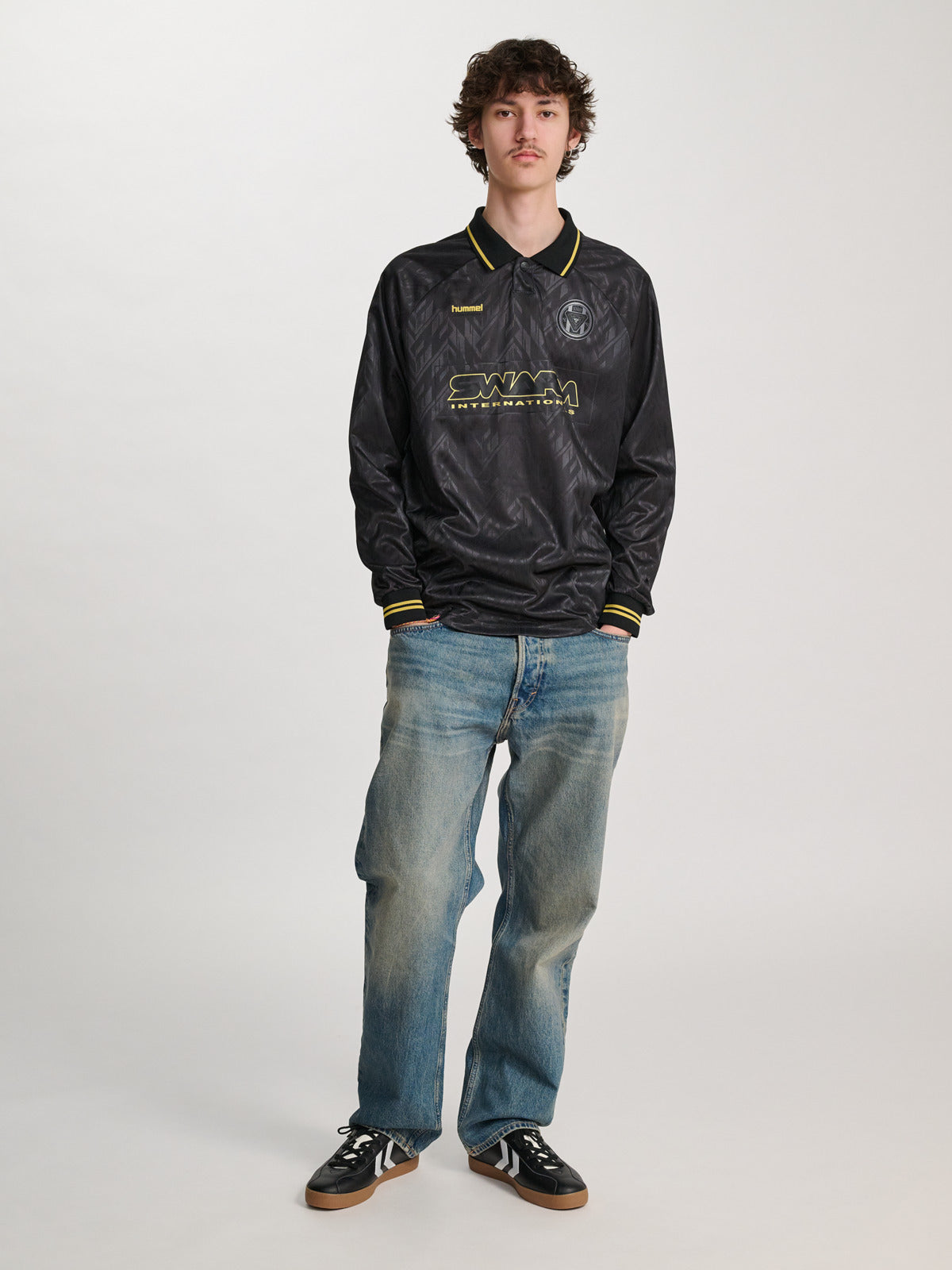 The hmlLOOSE BAY SOCCER JERSEY L/S brings vintage football aesthetics into modern streetwear. Made from shiny performance fabric in an oversized silhouette, this long-sleeved jersey features a button-up collar, stripe details at the cuffs and standout graphics across the chest and back. Finished with a classic hummel logo for an authentic touch.