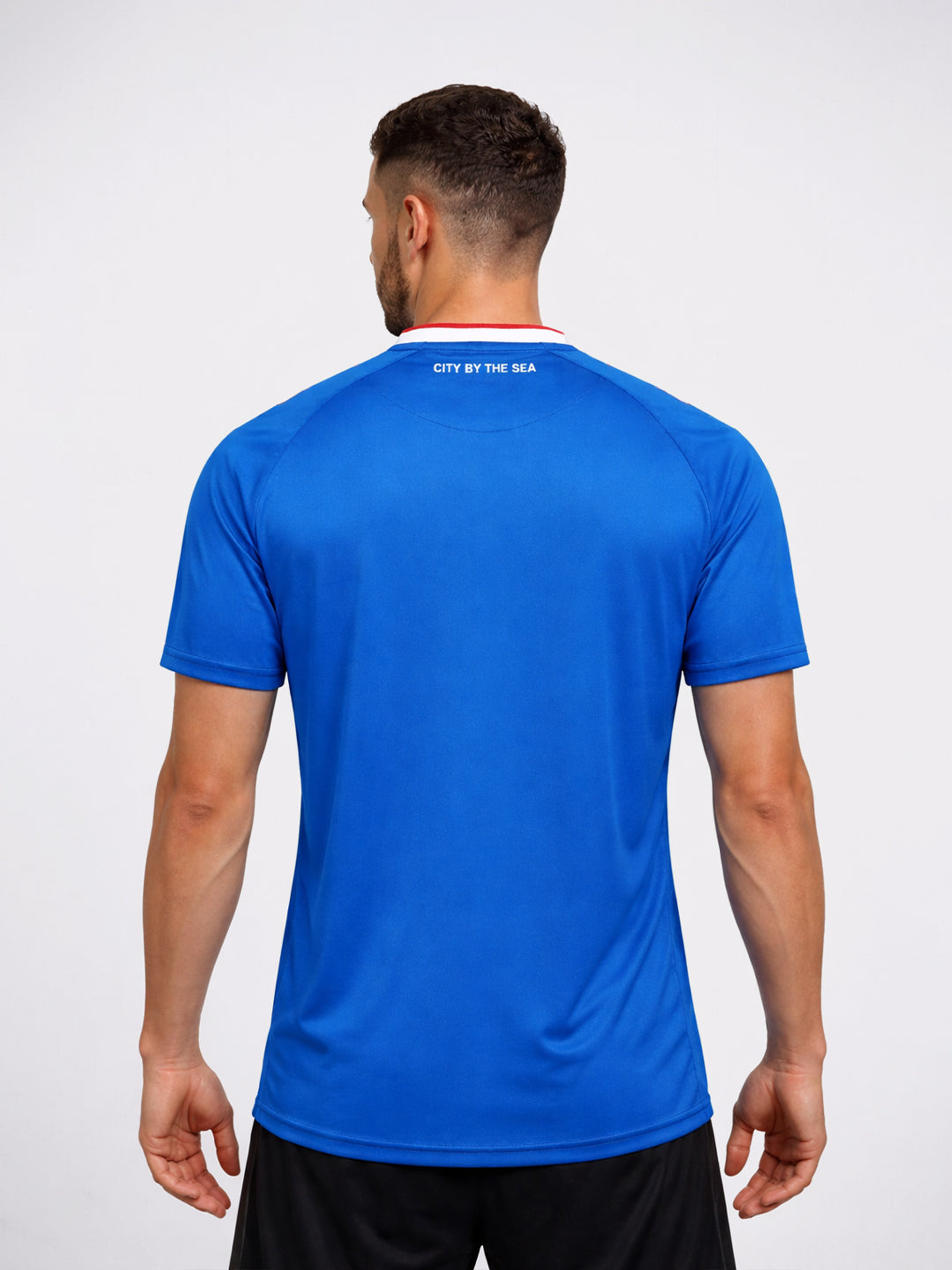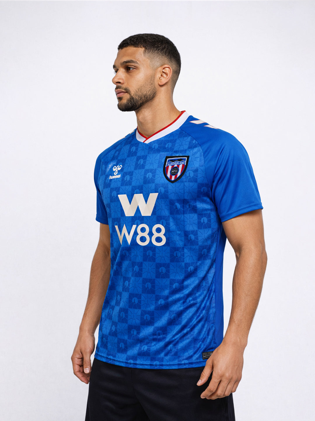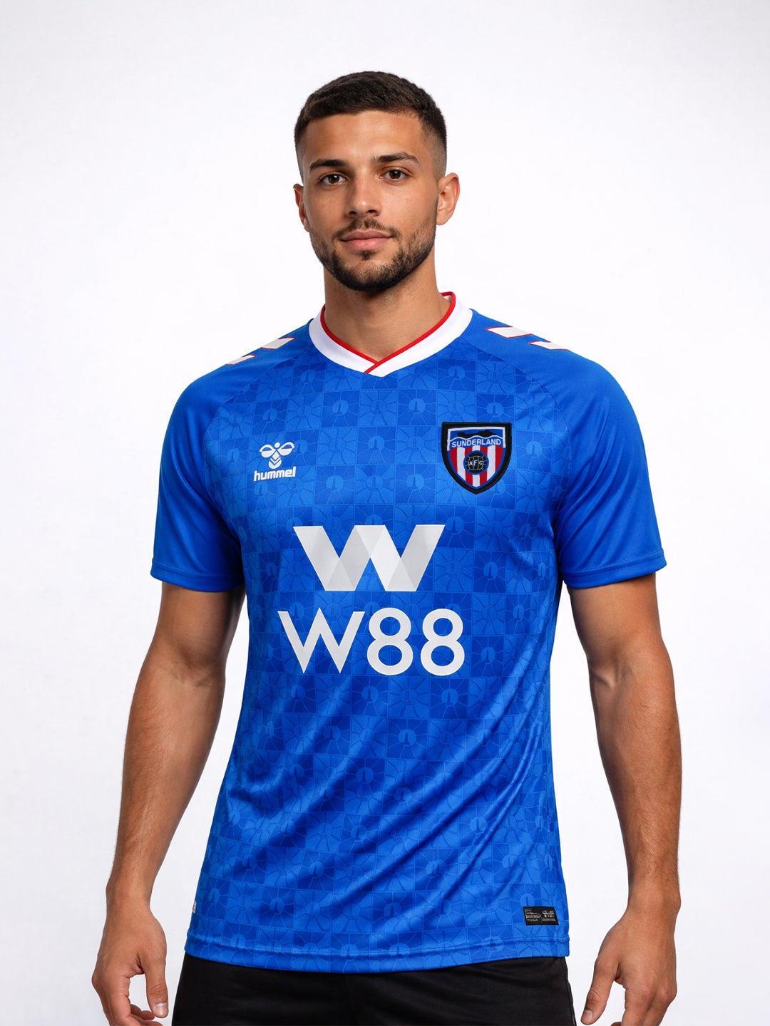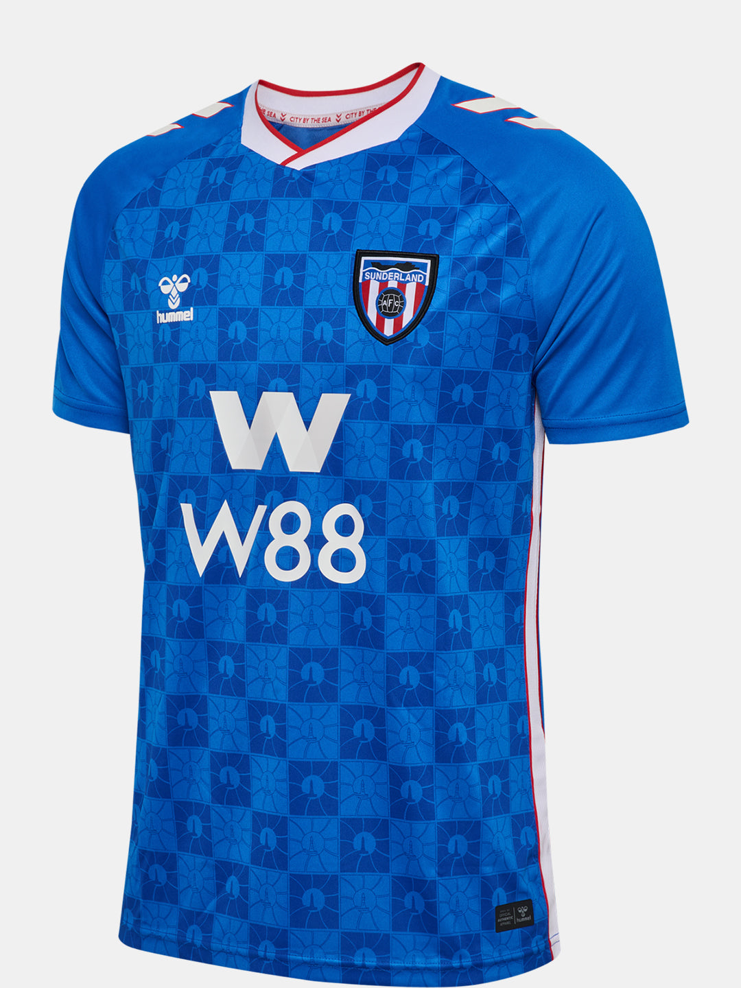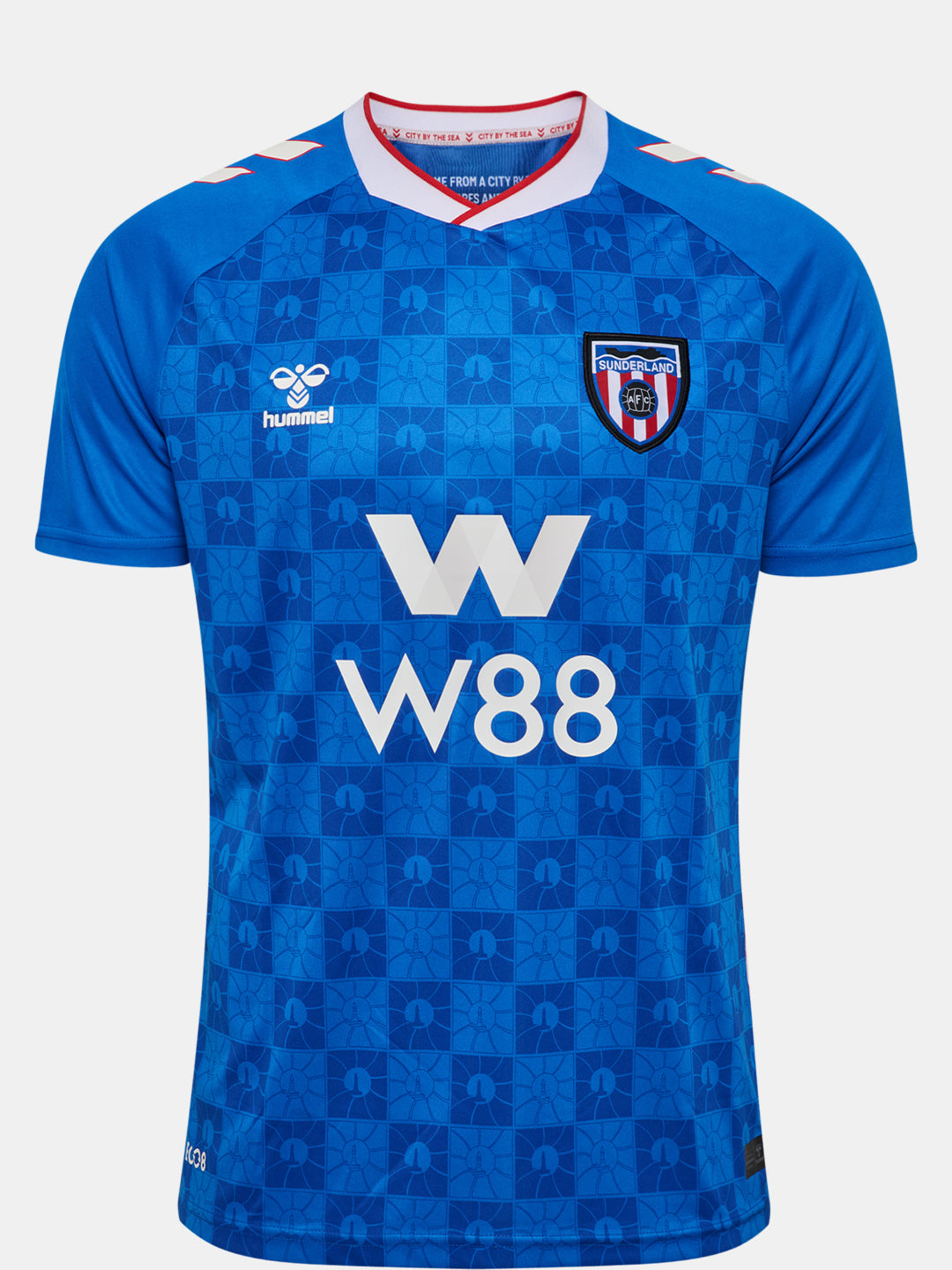 Sunderland’s 25/26 away jersey is designed in vibrant blue tones as a tribute to the “City by the Sea”. The front features a graphic pattern inspired by the Roker Lighthouse, while the hummel logo and club crest sit on the chest. The overlapped crew neck and printed hummel chevrons on the shoulders appear in white and red, creating a sharp contrast against the blue base. Inside the neck, the text “YES I COME FROM A CITY BY THE SEA AND ITS SHORES AND ITS WATERS HAVE BECOME A PART OF ME” pays tribute to the club’s coastal identity. The jersey is made from 100% recycled polyester.