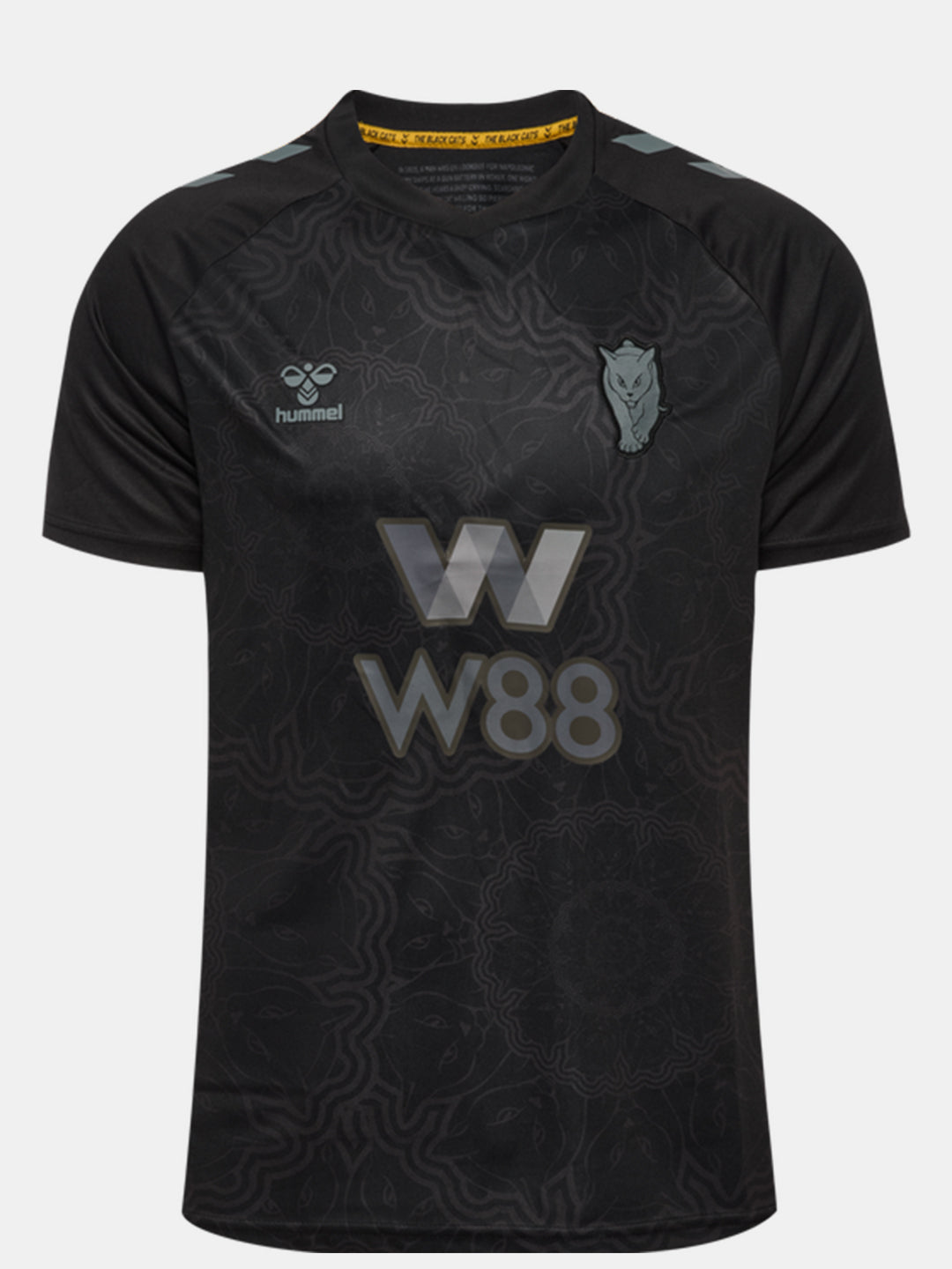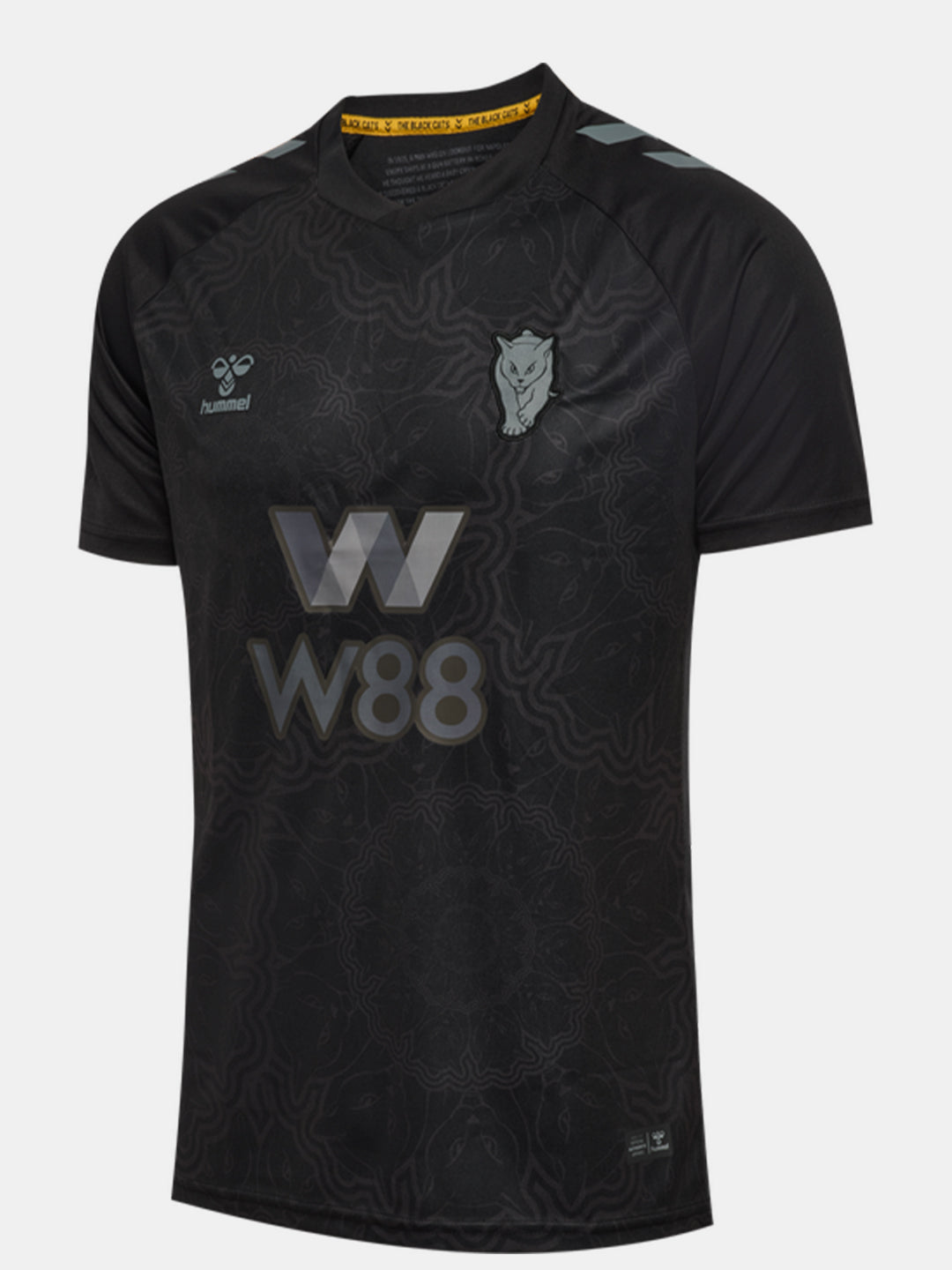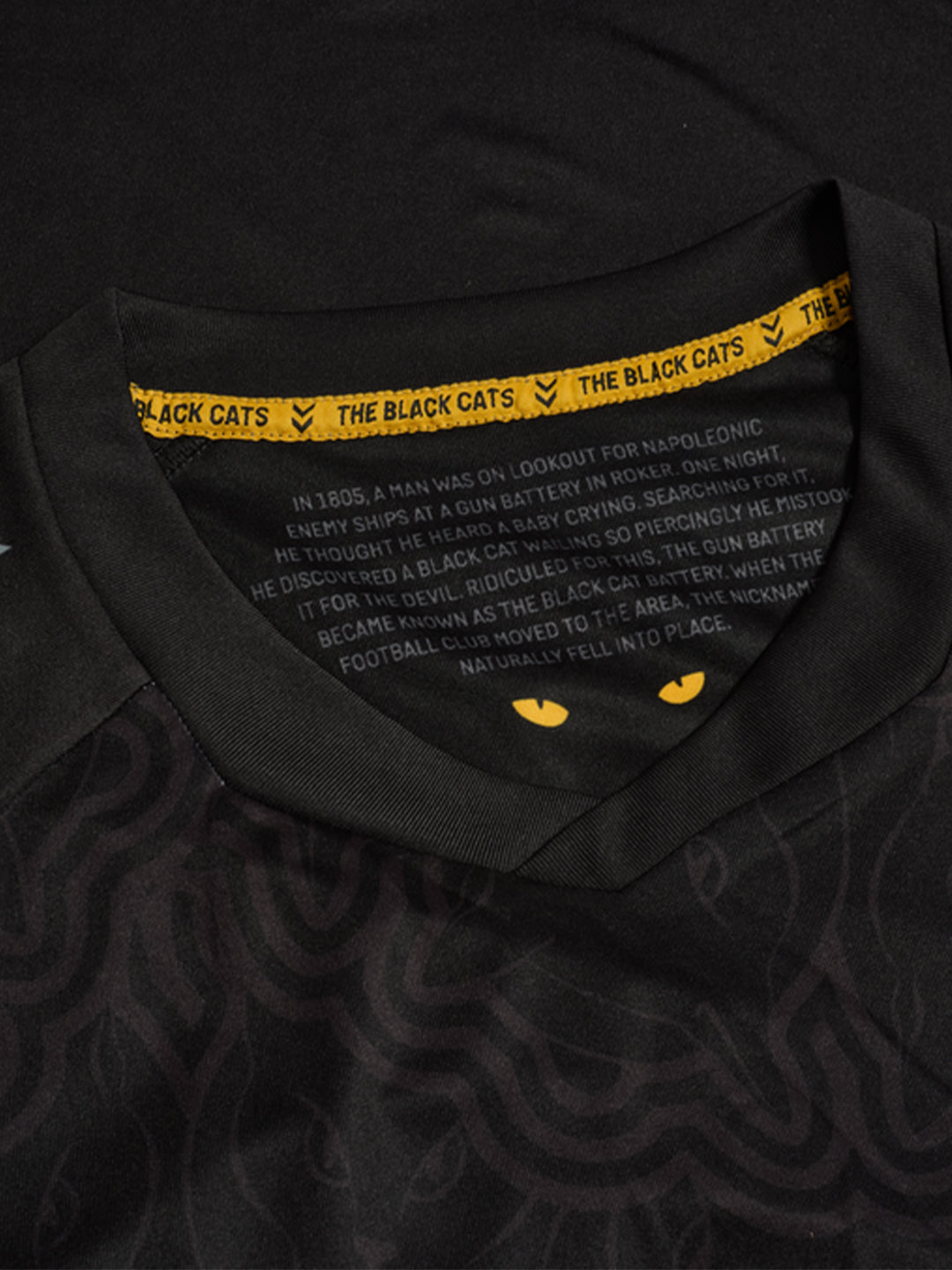 Sunderland’s 25/26 third jersey features an all-black base that highlights the club’s Black Cats identity. The chest showcases a subtle mandala pattern made up of 11 Black Cat emblems – one for each player on the pitch. The club crest and sponsor prints appear in greyscale, while a pair of yellow cat’s eyes stare out from the upper back. Inside the neck, another set of eyes appears, accompanied by a short “The Black Cats” story. hummel chevrons on the shoulders, raglan sleeves and an overlapped V-neck complete the look. The jersey is made from 100% recycled polyester.