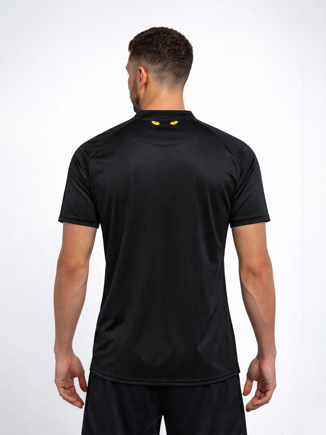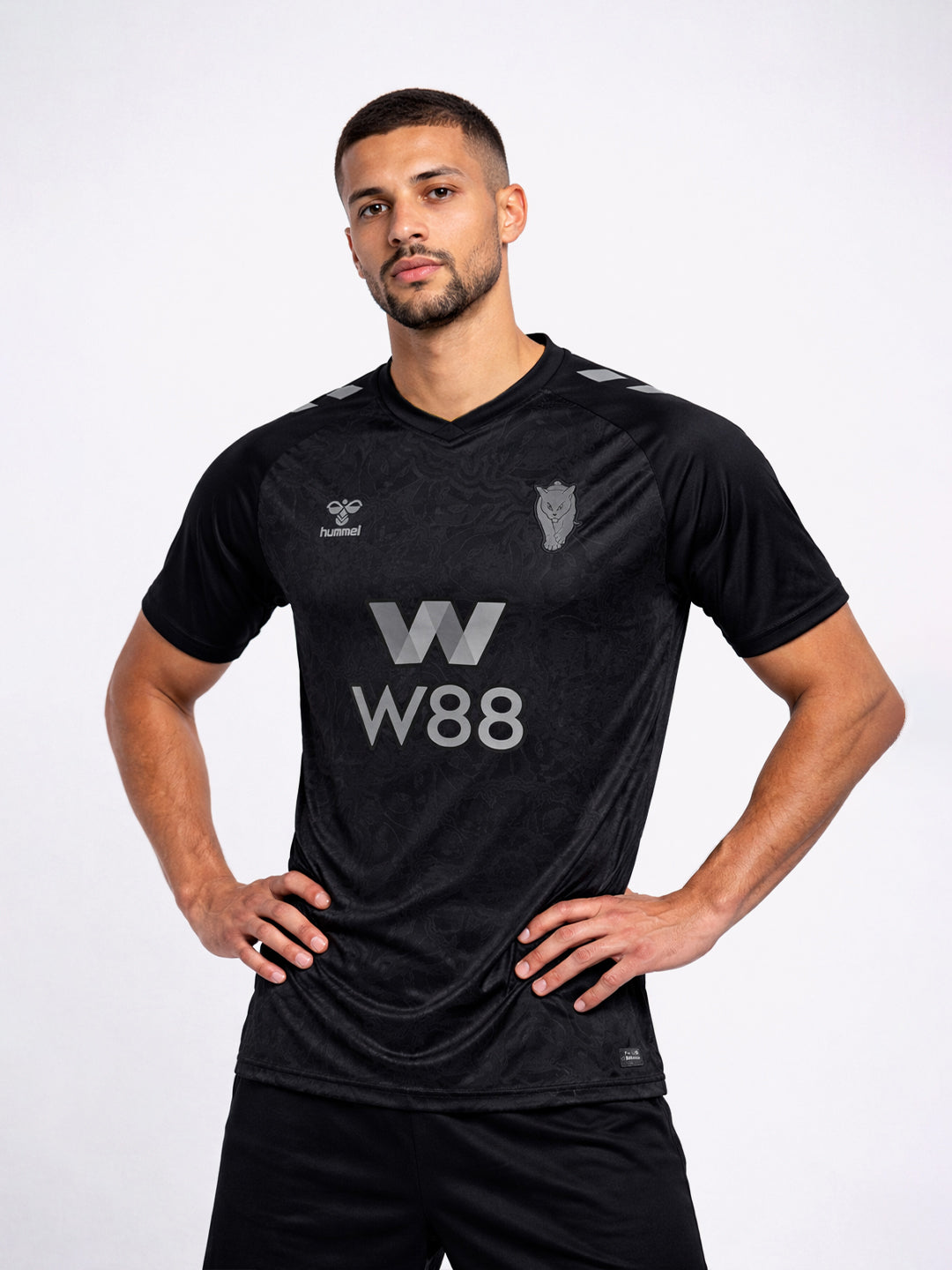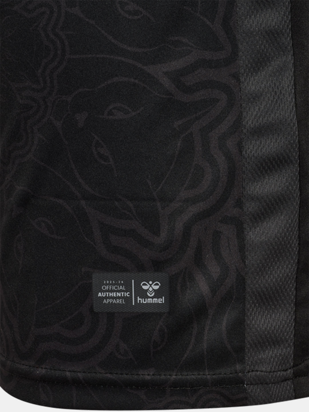 Sunderland’s 25/26 third jersey features an all-black base that highlights the club’s Black Cats identity. The chest showcases a subtle mandala pattern made up of 11 Black Cat emblems – one for each player on the pitch. The club crest and sponsor prints appear in greyscale, while a pair of yellow cat’s eyes stare out from the upper back. Inside the neck, another set of eyes appears, accompanied by a short “The Black Cats” story. hummel chevrons on the shoulders, raglan sleeves and an overlapped V-neck complete the look. The jersey is made from 100% recycled polyester.